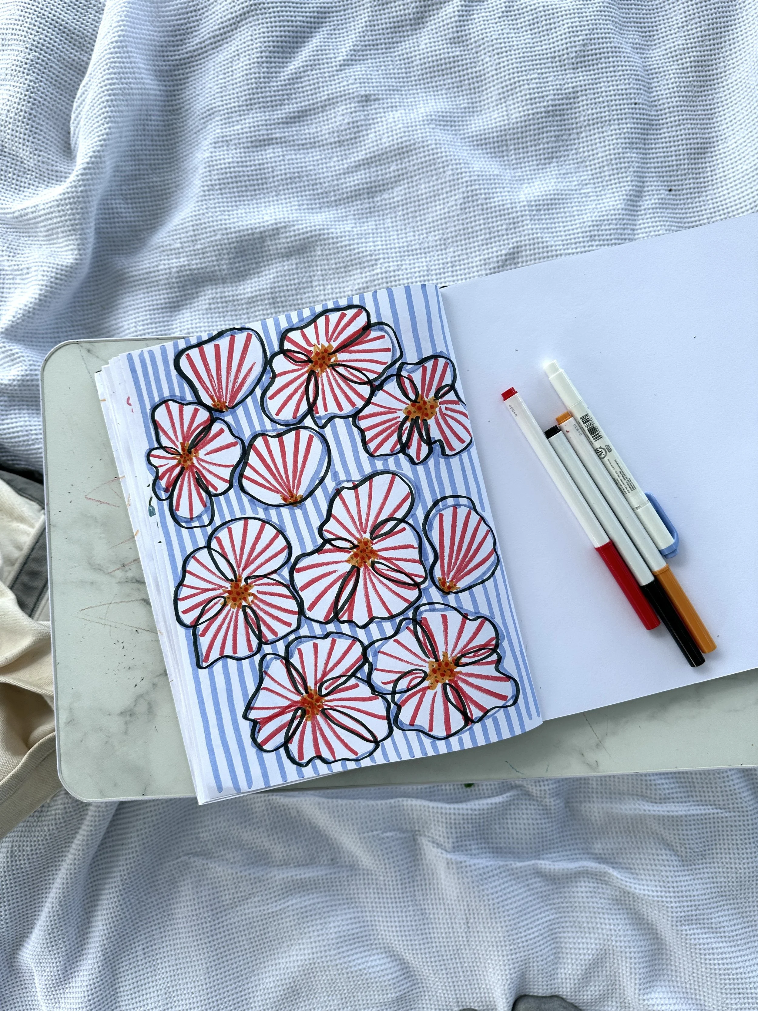 Because I was working with markers I didn’t feel like coloring in the whole pages of sketches and I ended up liking it. It gave me some ideas of things that I want to explore later. The image below is a loose sketch of poppies, playing with stripes and color.